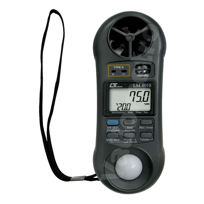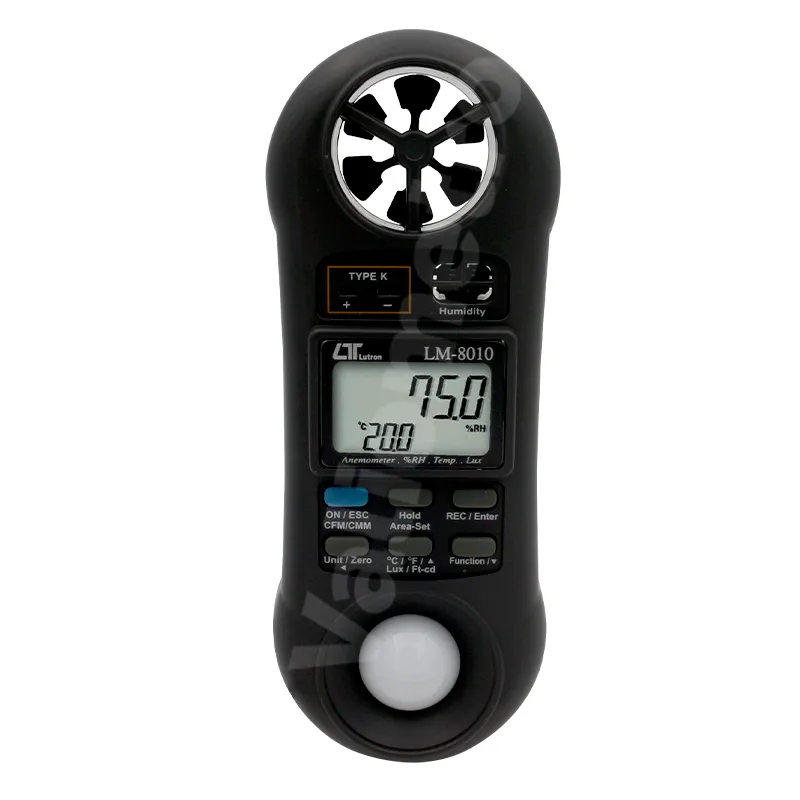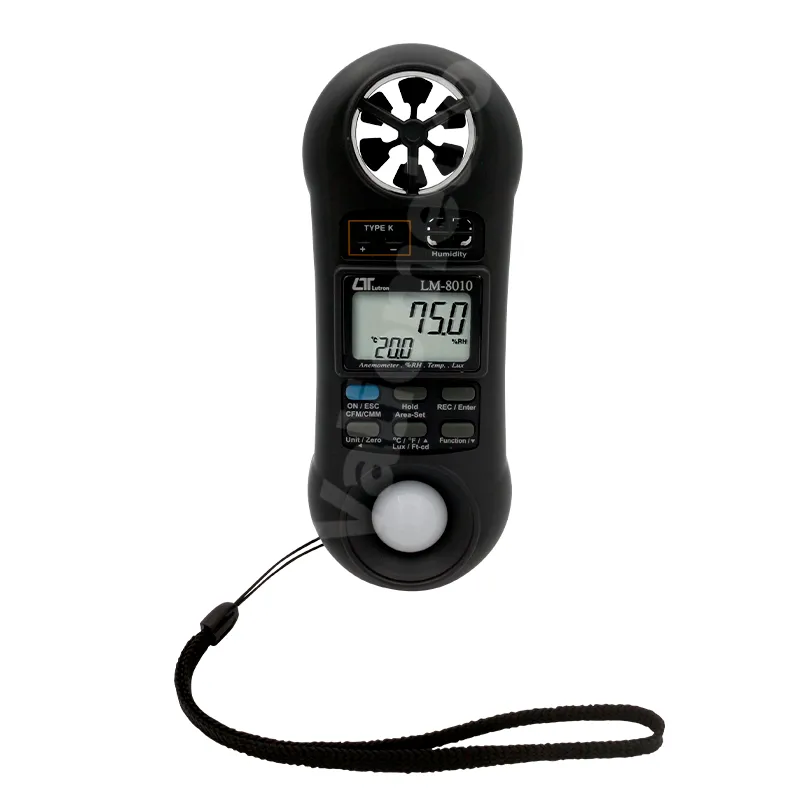 El anemómetro 5 en 1 LM-8010 ofrece mediciones de velocidad del aire, flujo, temperatura, humedad y luxómetro en un solo equipo.