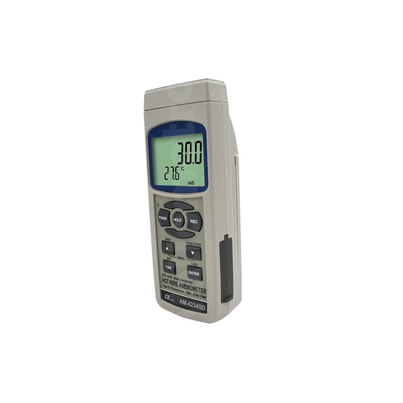 El anemómetro de hilo caliente AM-4234SD ofrece mediciones precisas de velocidad del aire, flujo, humedad y temperatura.