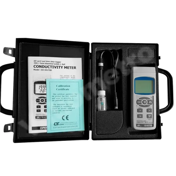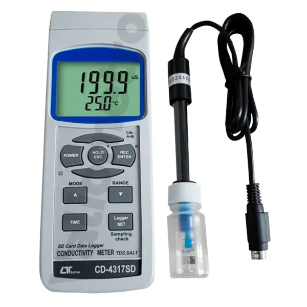 El Conductímetro portátil CD-4317SD con datalogger y registrador de datos es un equipo de alta precisión diseñado para la medición de conductividad, sólidos disueltos (TDS) y temperatura en agua y soluciones acuosas. Su formato portátil lo convierte en una herramienta práctica para trabajos en campo y en laboratorio. El CD-4317SD incorpora función de datalogger con memoria en tarjeta SD, permitiendo almacenar los resultados de manera continua y transferirlos fácilmente a un ordenador para su análisis. Ofrece un amplio rango de medición, con compensación automática de temperatura (ATC) que asegura lecturas confiables en distintas condiciones. Su pantalla LCD grande facilita la lectura clara de los valores, mientras que su diseño robusto garantiza un uso confiable en aplicaciones ambientales, industriales y de control de calidad del agua.
