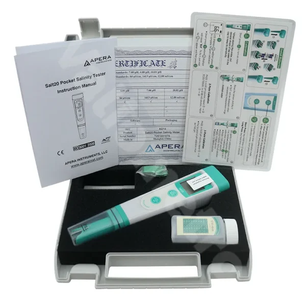 El Medidor de Salinidad Salt20 es un instrumento portátil y fácil de usar, ideal para la medición de salinidad en agua y soluciones líquidas. Diseñado en formato compacto tipo lapicero, cuenta con sensor de conductividad integrado y función de compensación automática de temperatura (ATC), lo que asegura resultados confiables y precisos en cualquier condición. El Salt20 ofrece un rango de medición amplio y alta resolución, adaptándose a diversas aplicaciones en acuicultura, hidroponía, piscigranjas, piscinas, laboratorios y control de calidad industrial. Su calibración automática facilita el manejo incluso a usuarios sin experiencia técnica, mientras que su estructura resistente al agua garantiza durabilidad y practicidad en campo. Es la herramienta ideal para quienes necesitan un monitoreo rápido, portátil y exacto de los niveles de salinidad.