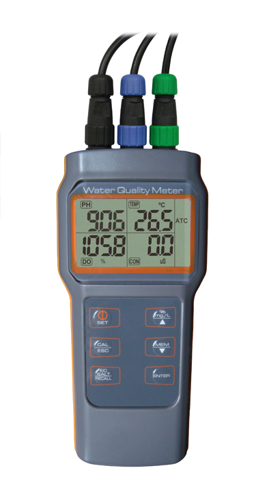 El medidor multiparámetro (Potenciometro) es un instrumento a prueba de agua que realiza mediciones de diversos parámetros del agua tales como el pH, la conductividad, la salinidad, el oxígeno disuelto y la temperatura. Práctico y completo en una sola inmersión, le muestra los resultados simultáneos de todas las mediciones sobre su gran pantalla.