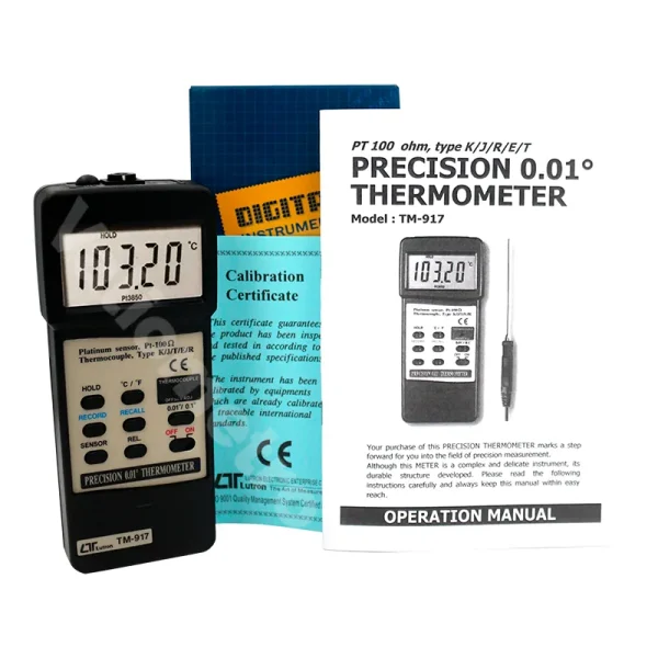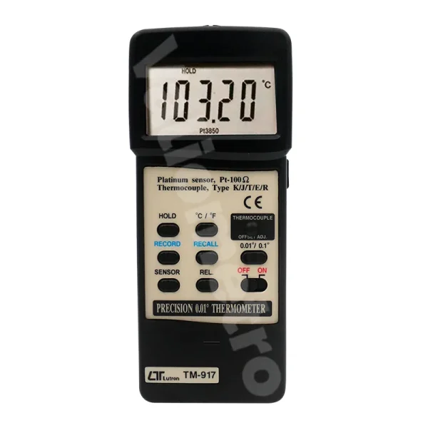 El Termómetro digital TM-917 ofrece mediciones de temperatura de alta precisión con resolución de 0.01°C.