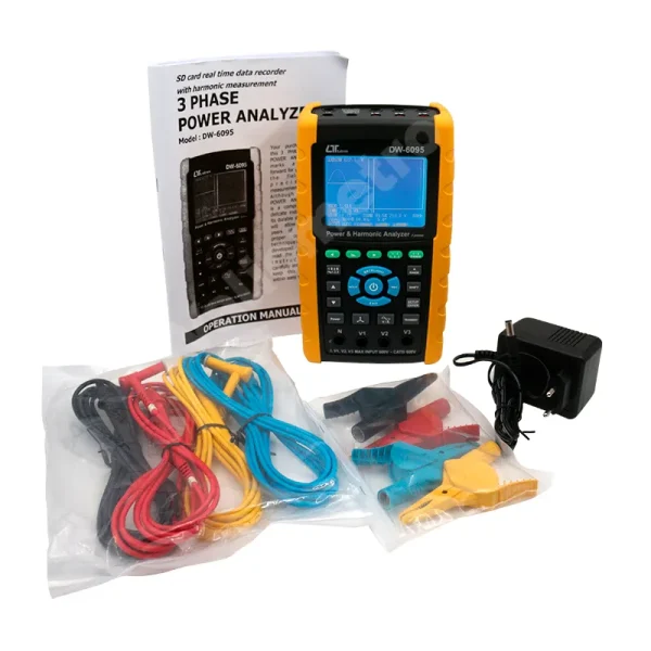 Analizador Trifásico de calidad de la energía con medida de armónicos y distorsión (THD). Para trabajos con 1 fase (2 o 3 conductores) ó con 3 fases (3 o 4 conductores). Con medidas de valor eficaz (TRMS) para tensión y corriente. Incorpora una gran pantalla retroiluminada con visualización general de los parámetros de la red. Ideal para localización de fallos en el suministro, análisis de perfil de carga y optimización de la energía. Portátil, robusto y fácil de usar.